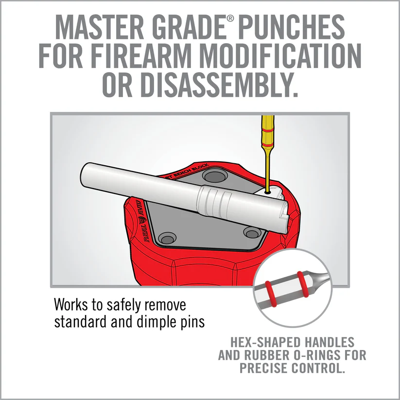 De Real Avid Accu-Punch Brass & Steel Pin Punch Set is een complete 11-delige set die speciaal ontworpen is voor het nauwkeurig werken aan vuurwapens, zoals het verwijderen of installeren van roll pins en stalen pennen. Met een combinatie van messing punches voor veilig gebruik op gevoelige oppervlakken en geharde stalen punches voor zwaar werk, is deze set ideaal voor zowel hobbyisten als professionele wapentechnici.