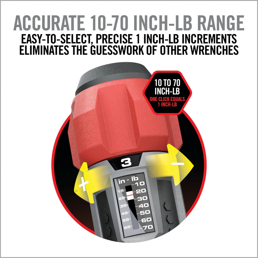 • Instelbare momentsleutel (10–70 inch-pounds) – met klikfeedback bij het bereiken van de ingestelde waarde