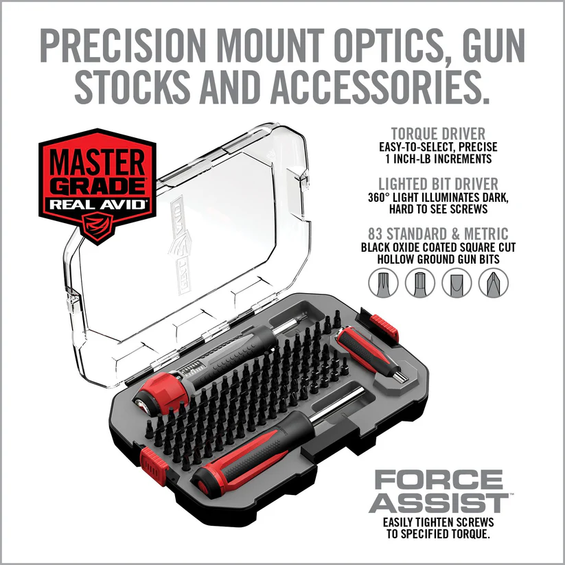 De Real Avid Smart Torq & Driver Master Set is een complete, hoogwaardige schroevendraaierset met instelbare momentsleutel (torque driver) en een uitgebreide selectie precisiebits. Deze set is ontworpen voor iedereen die met vuurwapens, scopes of fijnmechanische onderdelen werkt – van schutters en wapensmeden tot optiekinstallateurs en techneuten.